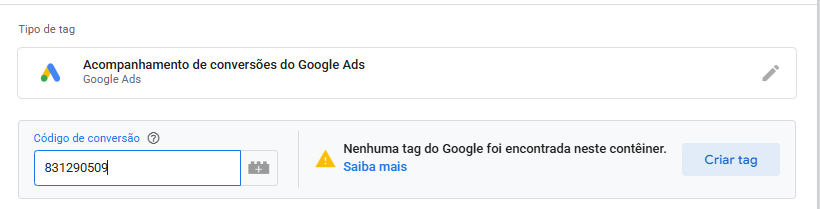Após inserir o código de conversão, pode aparecer uma solicitação para criar uma tag do Google.