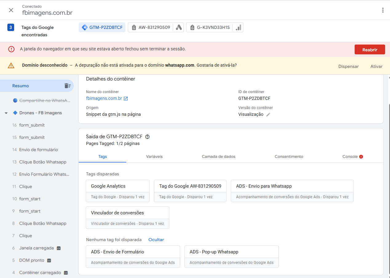 - Após enviar, volte à tela de preview do Tag Manager