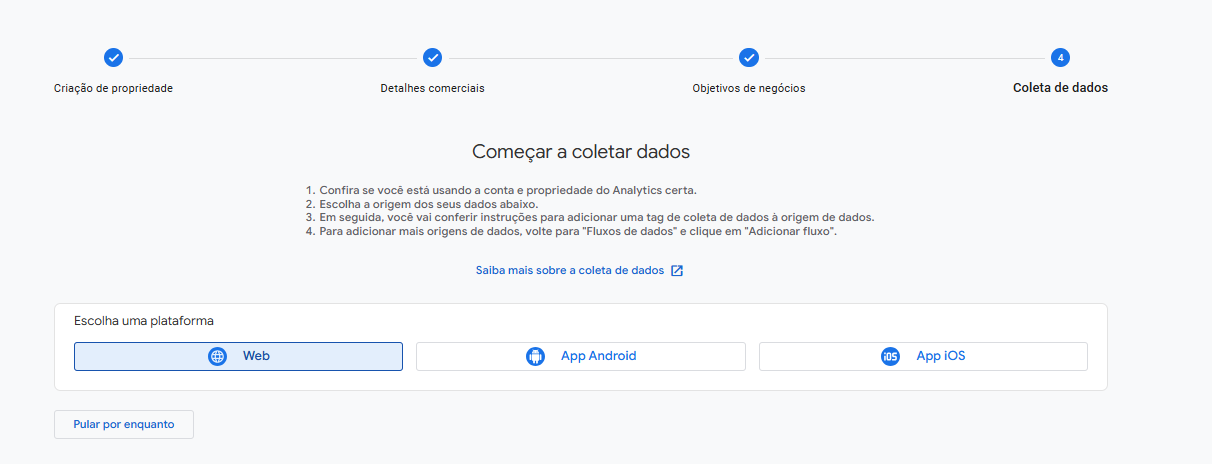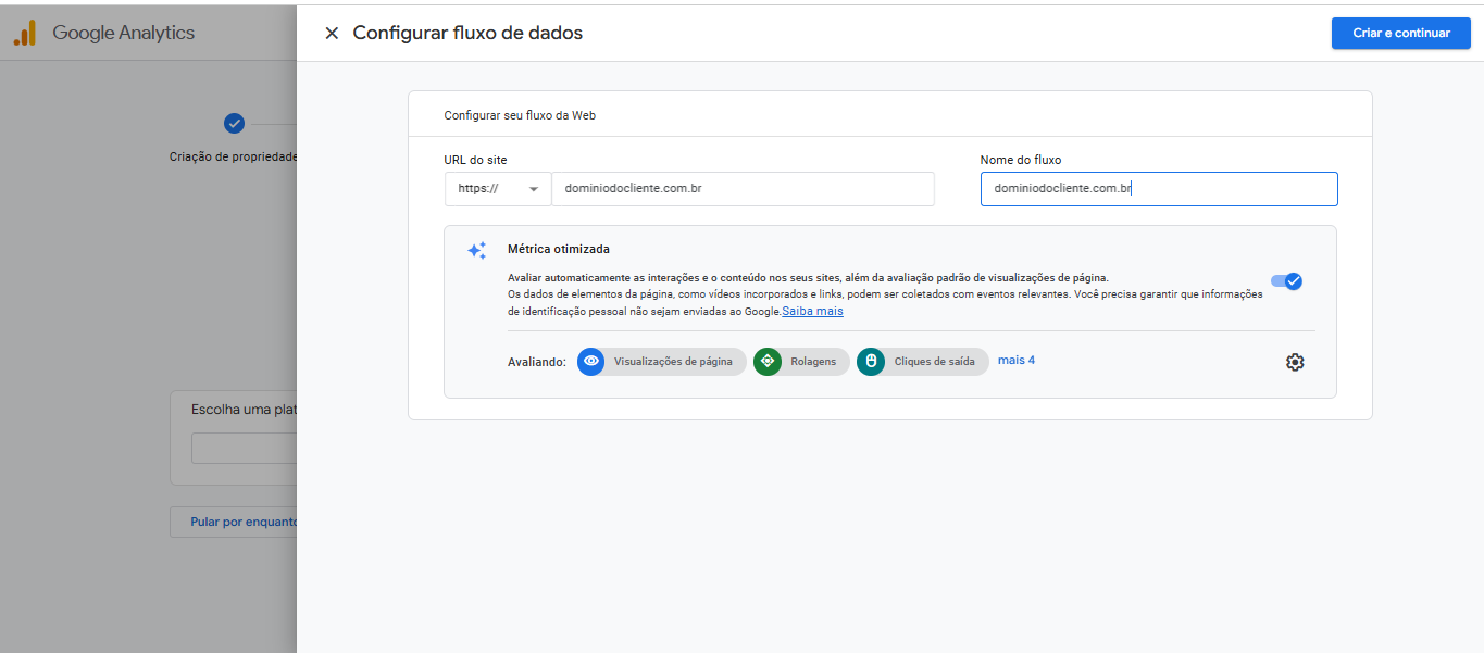 - Selecione Plataforma: Web, insira o domínio nos dois campos e clique em Avançar
