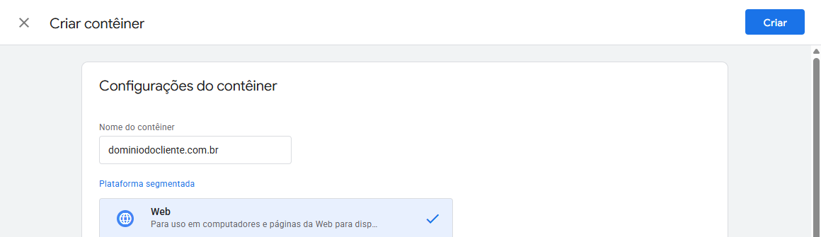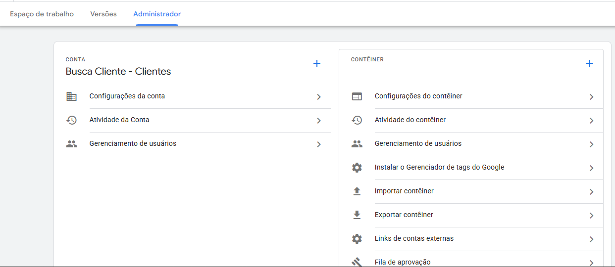 bcrelatoriotag@gmail.com - Clique em Administrador → + → Criar contêiner